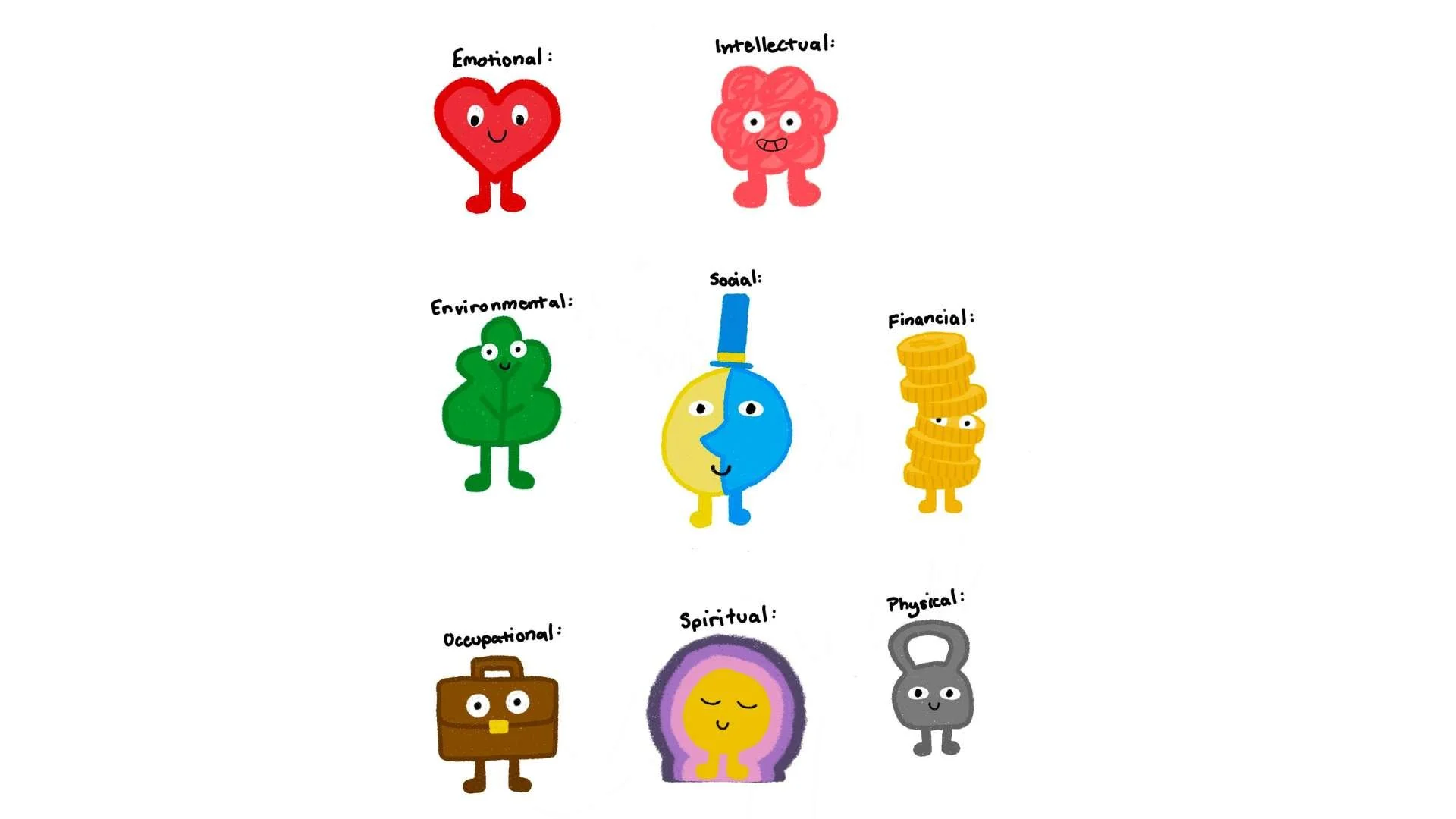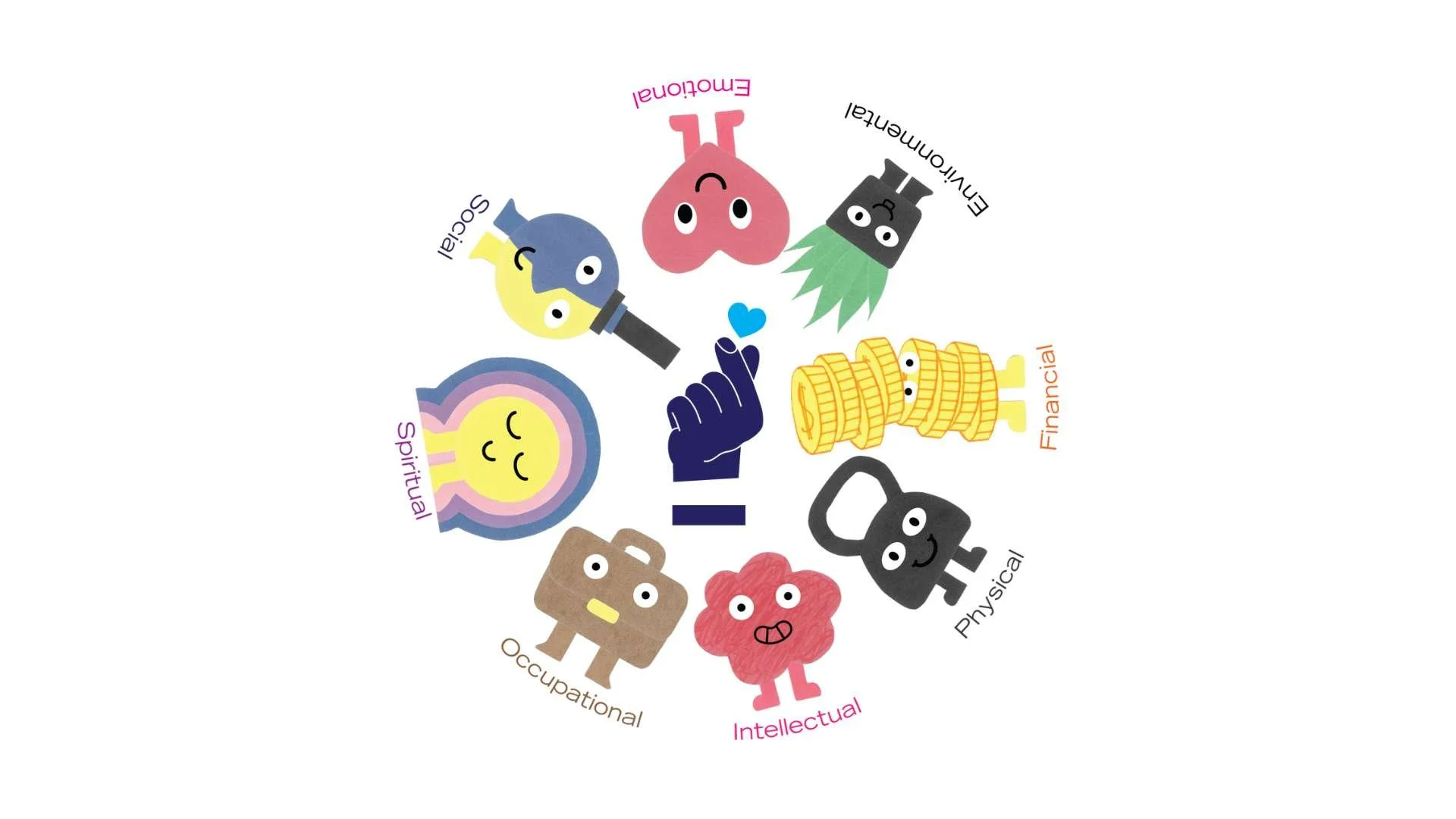 A: The simplicity in designs is great for accessibility and the team wanted to create visuals that were easy to understand to the majority of students, especially since ‘Dimensions of Wellness’ can be a new topic for so many people.