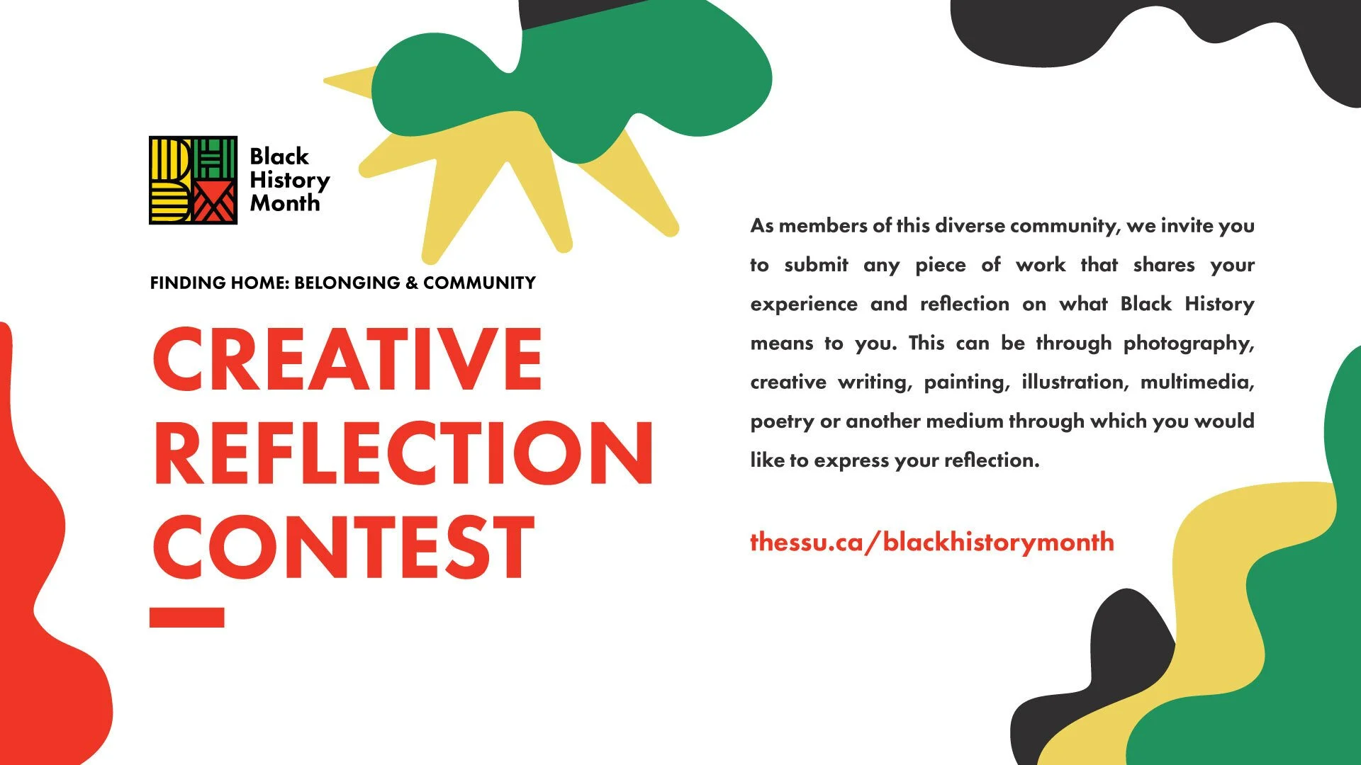 1. All Creative Reflections should stay true to the theme "Finding Home: Belonging & Community" and celebrate Black History: We encourage students to honour Black History Month in their own unique way and use the theme as a guide for their reflection. Only reflections that align with the theme will be considered.