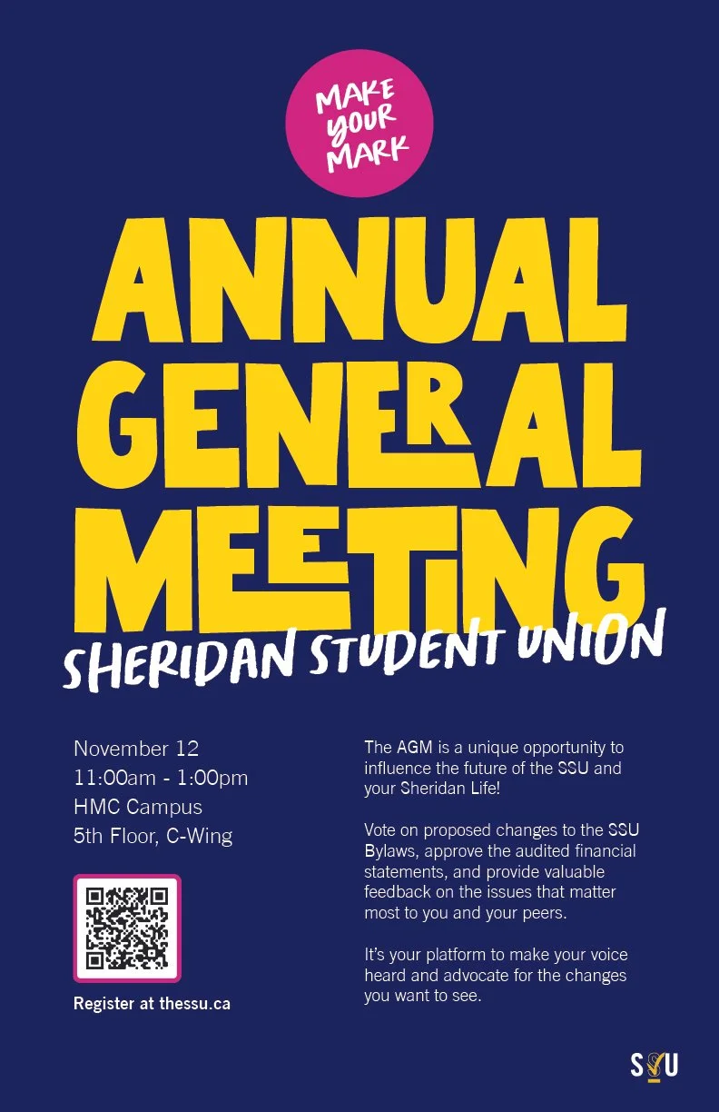 Sheridan Student Union’s Annual General Meeting (AGM) is a chance for you to directly impact the direction of the SSU. At this meeting, you will vote on important bylaws and policy changes that can affect your student experience and advocate for the changes you want to see.